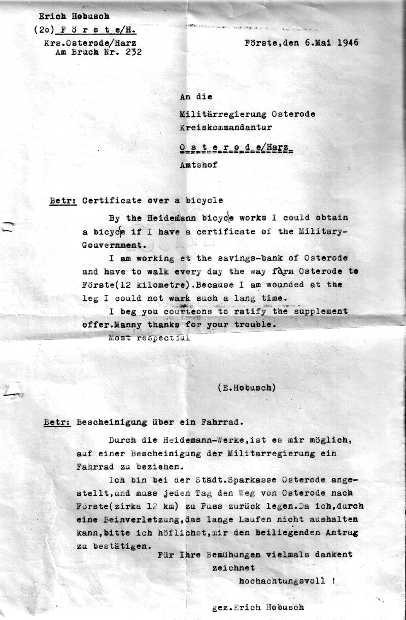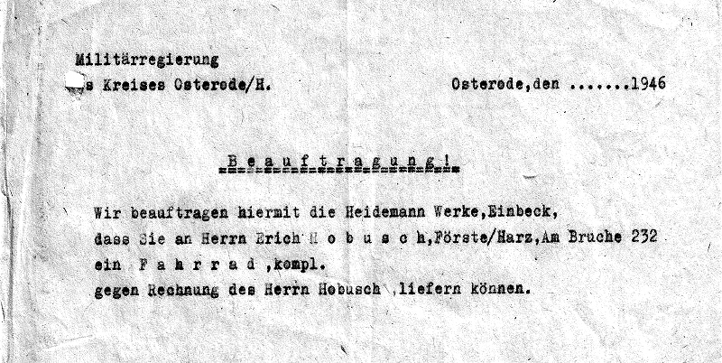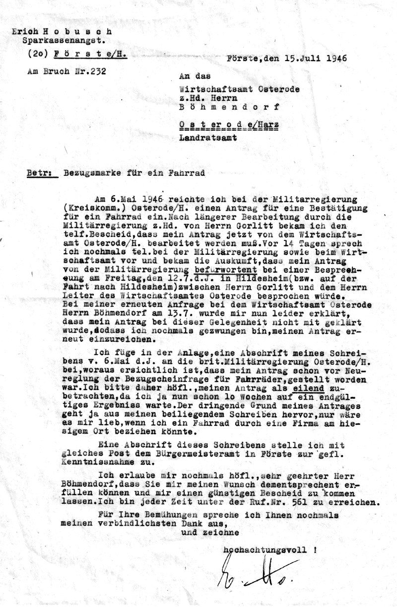 EH stellt bei der englischen Militäregierung in Osterode auch einen Antrag auf den Bezug eines Fahrrades.
