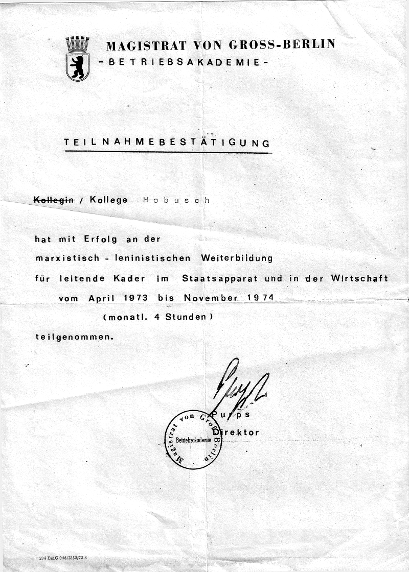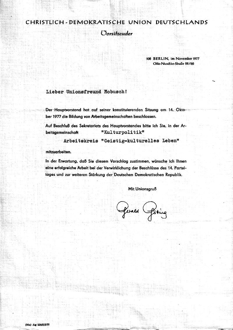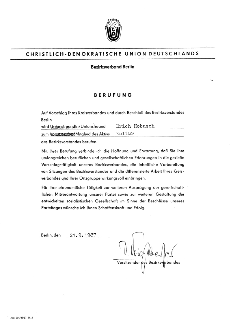 Auch wird EH als Mitglied des Aktivs "Kultur" des Bezirksvorstandes Berlin der Ost-CDU berufen.