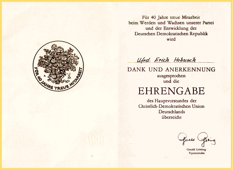 Urkunde und Ehrengabe für 40 Jahre treue Mitarbeit in der Ost-CDU, unterschrieben vom Vorsitzenden des Hauptvorstandes Gerald Götting.