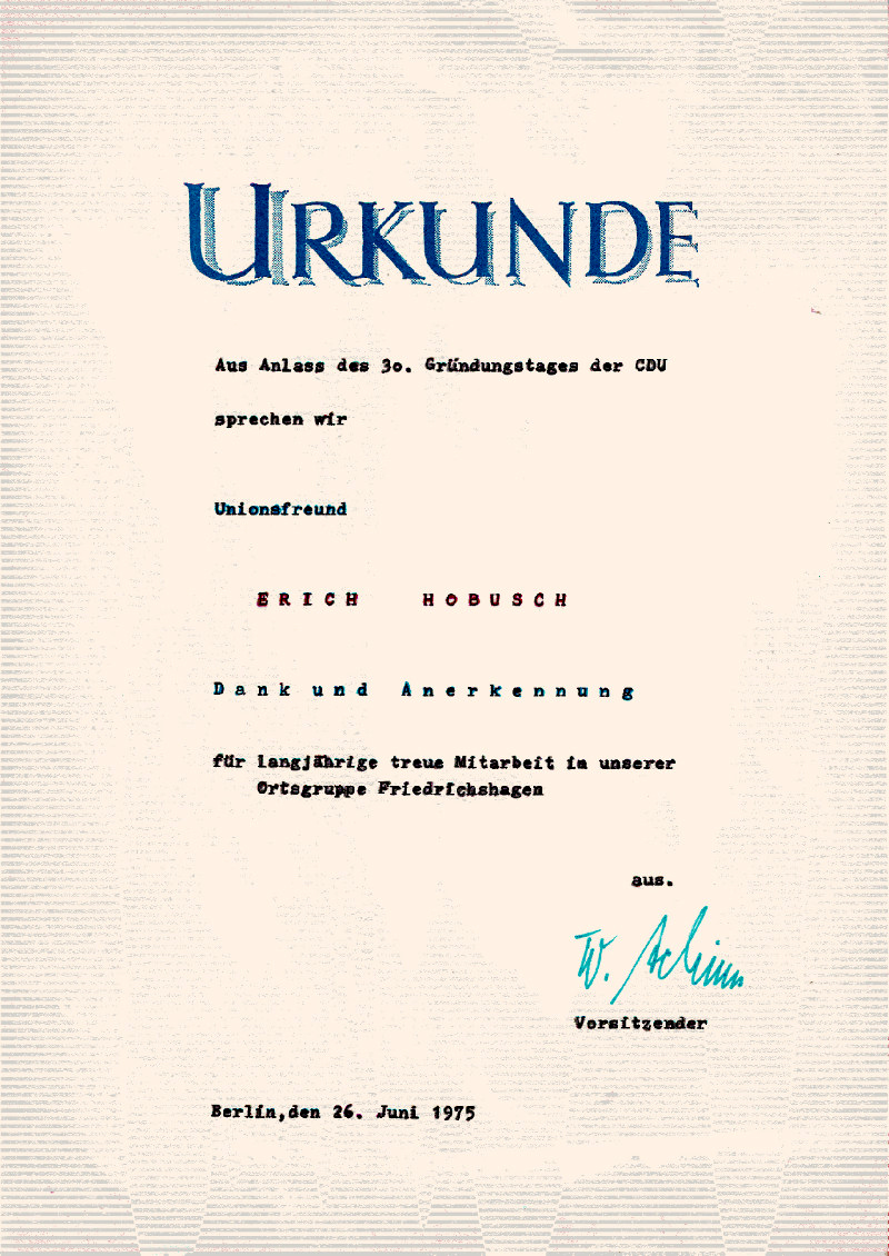 Anläßlich des 30. Jahrestages dankt der Ortsverband der Ost-CDU dem Unionsfreund Hobusch für langjährige Mitarbiet in der Ortsgruppe Friedrichshagen.