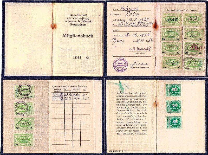 Das Mitgliedsbuch der Gesellschaft zur Verbreitung wissenschaftlicher Erkenntnisse (Urania) enthält Jahresbeitragsmarken und eine Präambel zum gesellschaftlichen Auftrag.