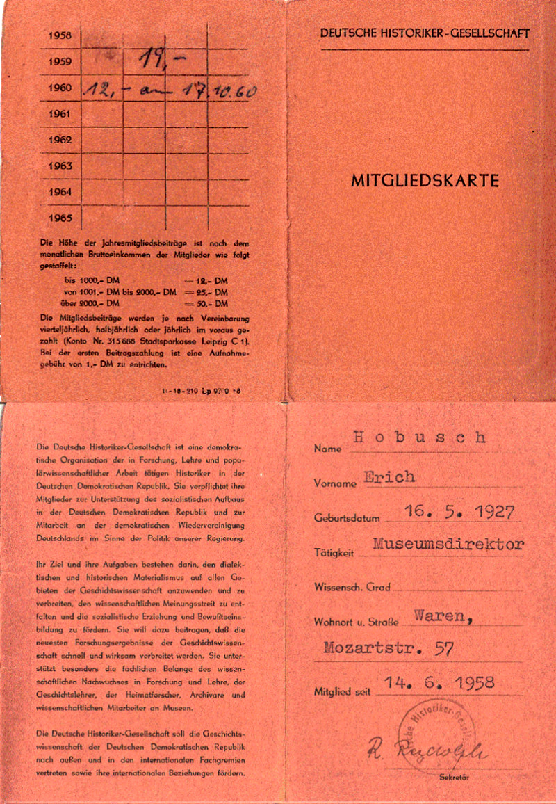 Die Mitgliedschaft bei der Deutschen Historiker-Gesellschaft wird mit einer Karte, die eine Präambel zur Zielstellung und Aufgaben in der DDR enthält, nachgewiesen.