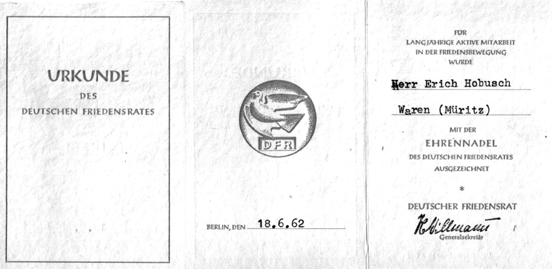 Der Deutsche Friedensrat verleiht an EH die Ehrennadel des Deutschen Friedensrates für die langjährige aktive Mitarbeit in der Friedensbewegung.