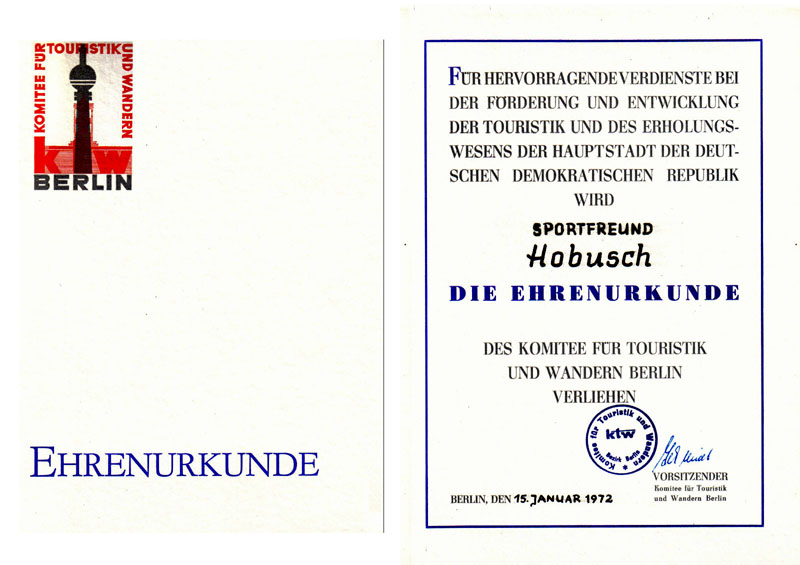 Das Staatliche Komitee für Touristik und Wandern würdigt die hervorragende Verdienste bei der Förderung und Entwicklung der Touristik und des Erholungswesens mit einer Ehrenurkunde.