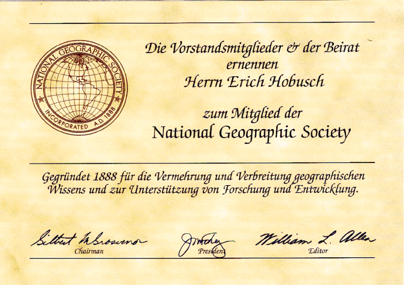 EH wird Mitglied der 1888 in Washington gegründeten National Geographic Society und erhält eine Ernnennungsurkunde.
