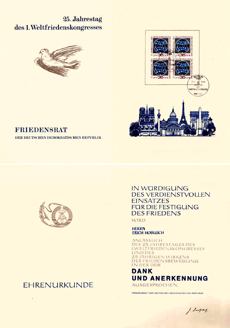 EH erhält eine Ehrenurkunde in Würdigung des verdienstvollen Einsatzes für die Festigung des Friedens anlässlich 25. Jahrestages des ersten Weltfriedenskongresses.