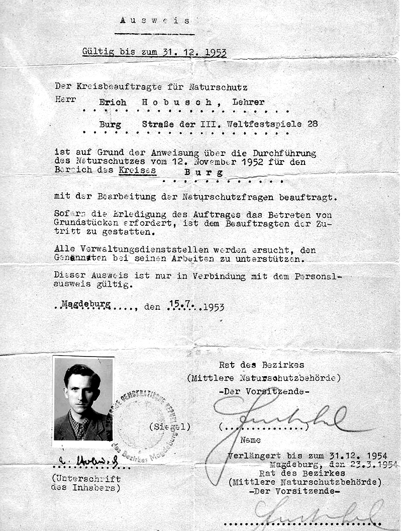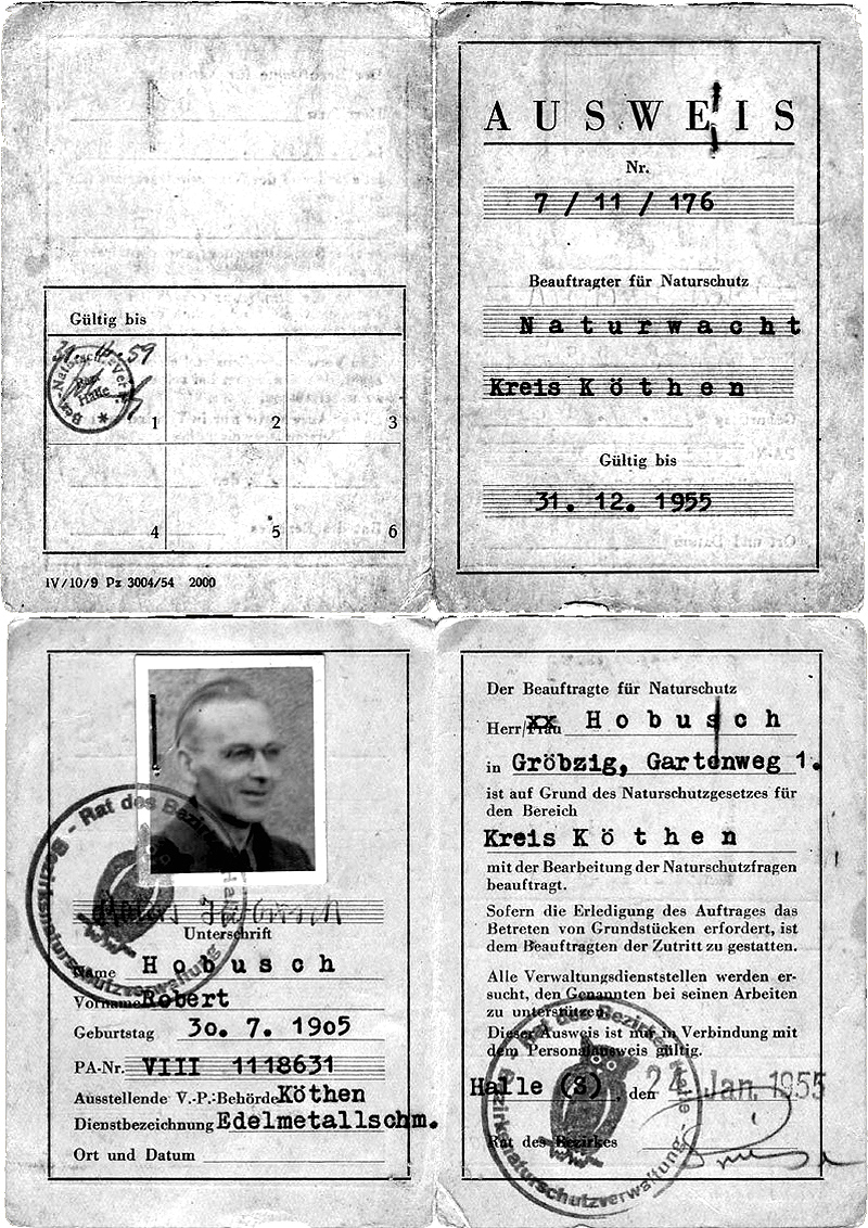 Dem Vater von EH, Herrn Robert Hobusch wird ein Ausweis als Beauftragter für Naturschutz für den Kreis Köthen von der Naturschutzverwaltung des Rat des Bezirkes Halle ausgestellt.