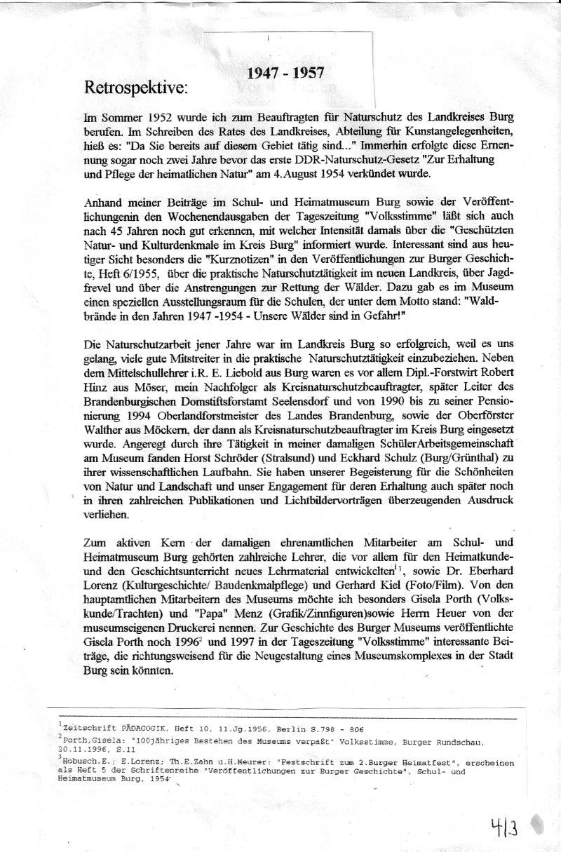 EH erinnert sich in einem von ihm selbst verfaßten Artikel an den Zeitabschnitt 1947-1957 als Beauftragter für Naturschutz des Landkreises Burg.