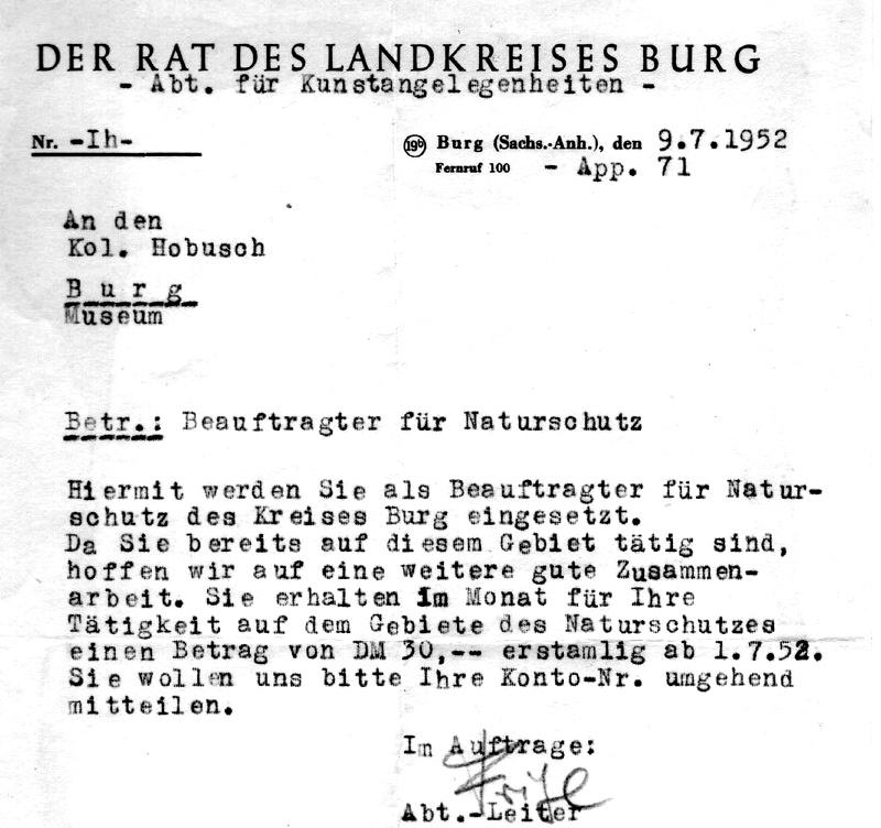 Der Rat des Landkreises Burg, Abt. für Kunstangelegenheiten, setzt EH als Beauftragten für Naturschutz ein.