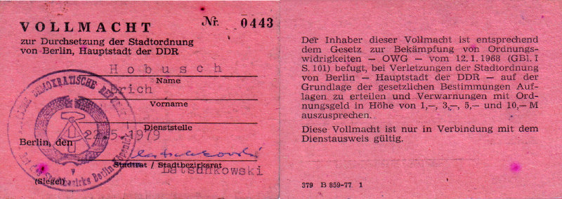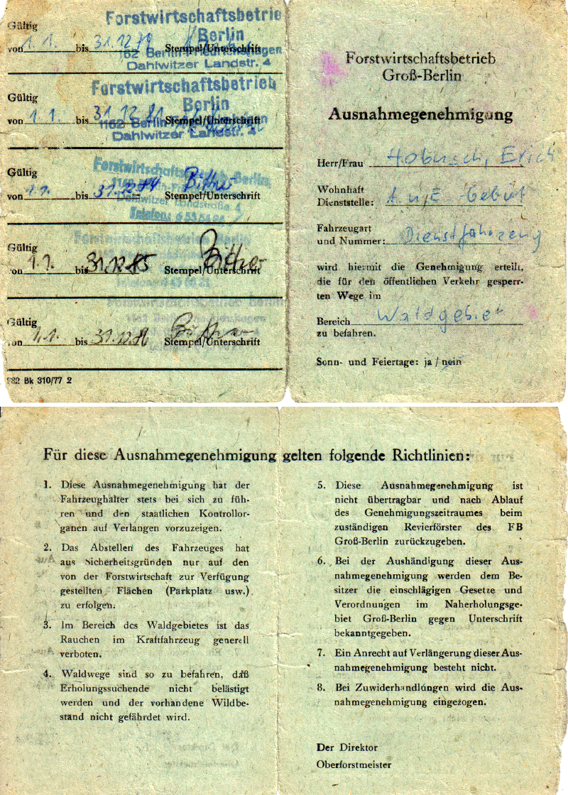 Der zuständige Stadtbezirksrat in Berlin Köpenick stellt EH eine Vollmacht zur Durchsetzung der Stadtordnung von Berlin, Hauptstadt der DDR, aus und der Forstwirtschaftsbetrieb Groß-Berlin eine Ausnahmegenehmigung für Kfz.