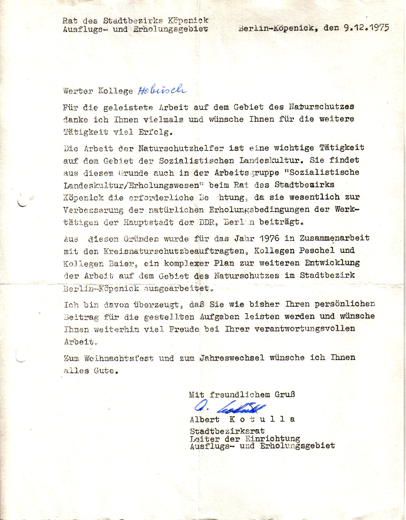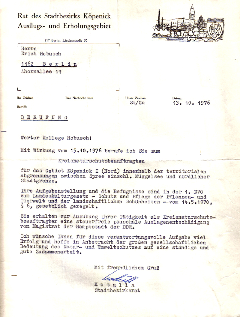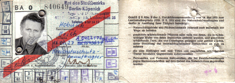 Der Rat des Stadtbezirkes Berlin-Köpenick, Abt. Ausflugs- und Erholungsgebiet, stellt EH einen Ausweis als Kreis-Naturschutz-Beauftragter aus.