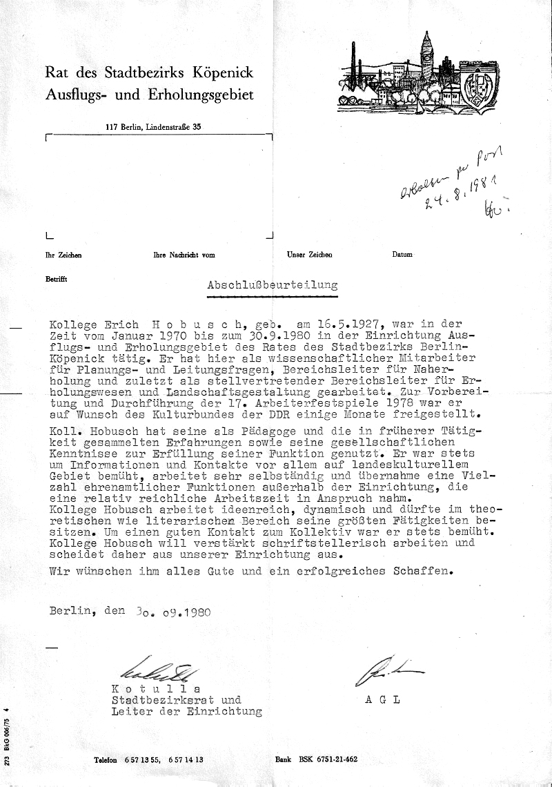 Das Sachgebiet "Ausflugs- und Erholungsgebiet" des Rates des Stadtbezirks Berlin-Köpenick fertigt für EH eine Abschlußbeurteilung anläßlich der Aufnahme einer freiberuflichen Tätigkeit aus.
