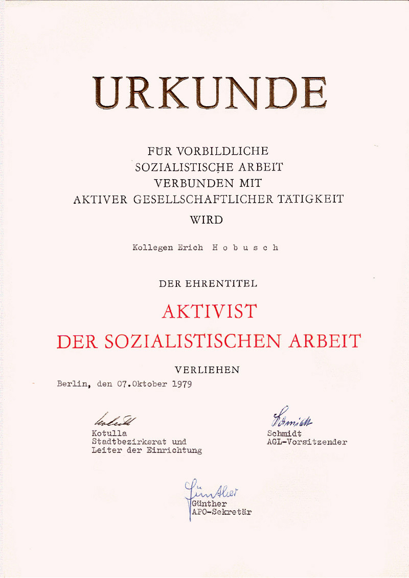 An EH wird der Ehrentitel "Aktivist der sozialistischen Arbeit" verliehen.