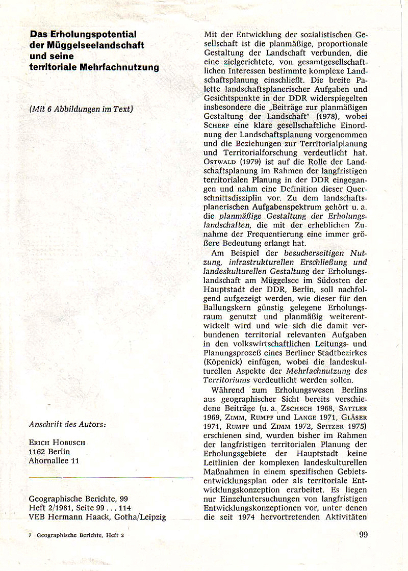 Die von EH verfasste Studie "Das Erholungspotential der Müggelseelandschaft und seine territoriale Mehrfachnutzung" wird im Heft 2 der "Geografischen Berichte" veröffentlicht.