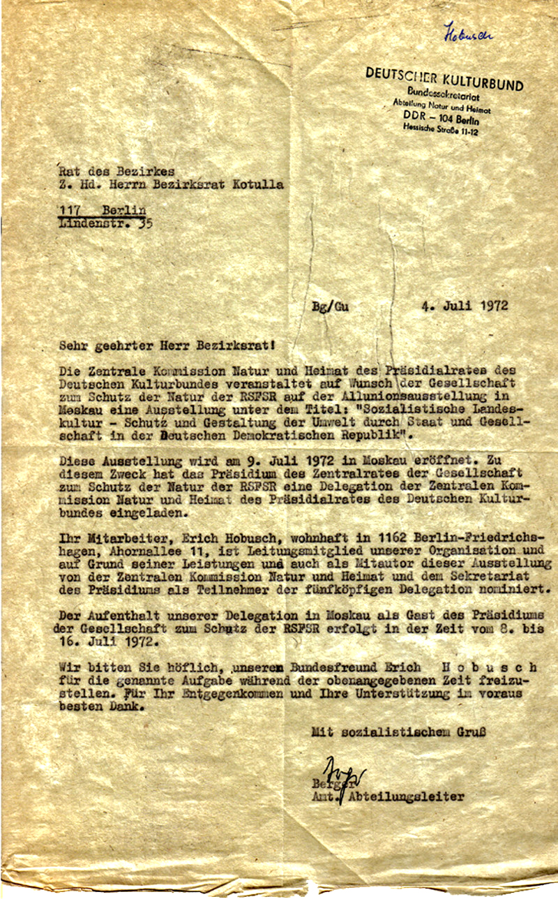 Das Bundessekretariat des Deutschen Kulturbundes bittet um die Freistellung von EH von seinen dienstlichens Obliegenheiten als leitender Mitarbeiter beim Berliner Stadtbezirk Berlin-Köpenick.