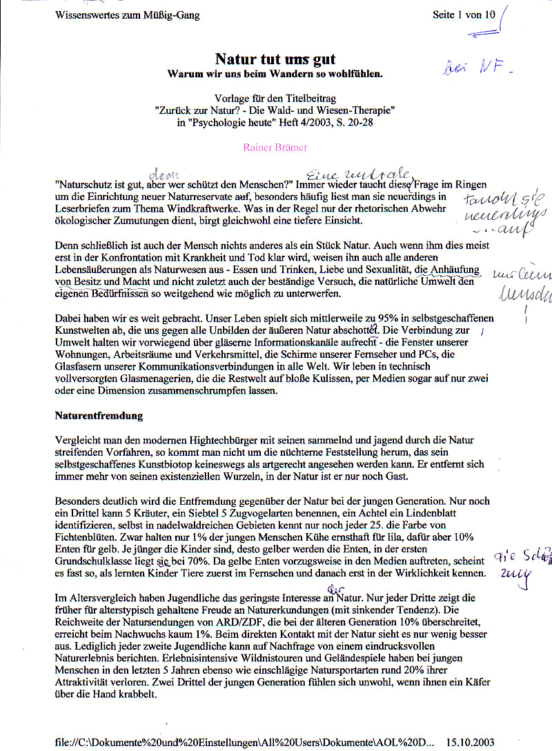 | Aufsatz "Natur tut uns gut - warum wir uns beim Wandern wohlfühlen" mit Korrekturhinweisen. |