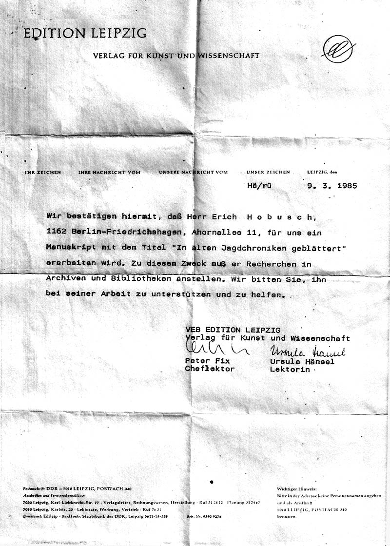 Kunstverlag bescheinigt, daß EH am Sachbuch "In alten Jagdchroniken geblättert" arbeitet.