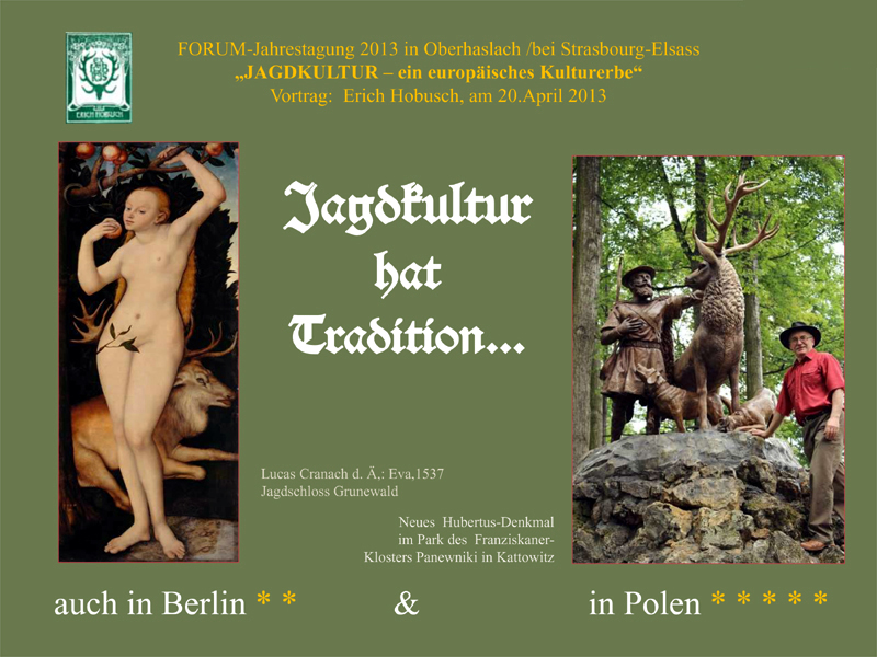 Jahrestagung des FORUMS JAGDKULTUR e.V. 2013. in Oberhaslach (bei Strasbourg-Elsass). „JAGDKULTUR – ein europäisches Kulturerbe". Vortrag von Erich Hobusch am 20.April 2013