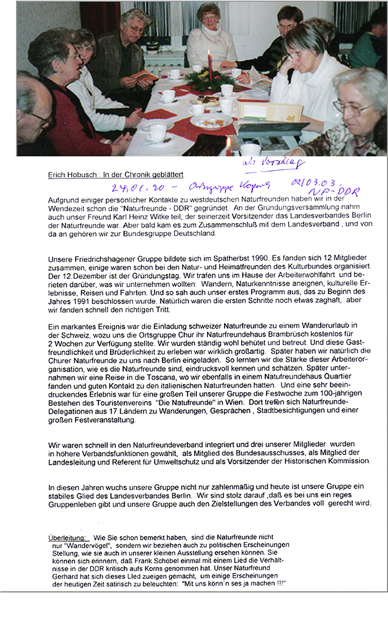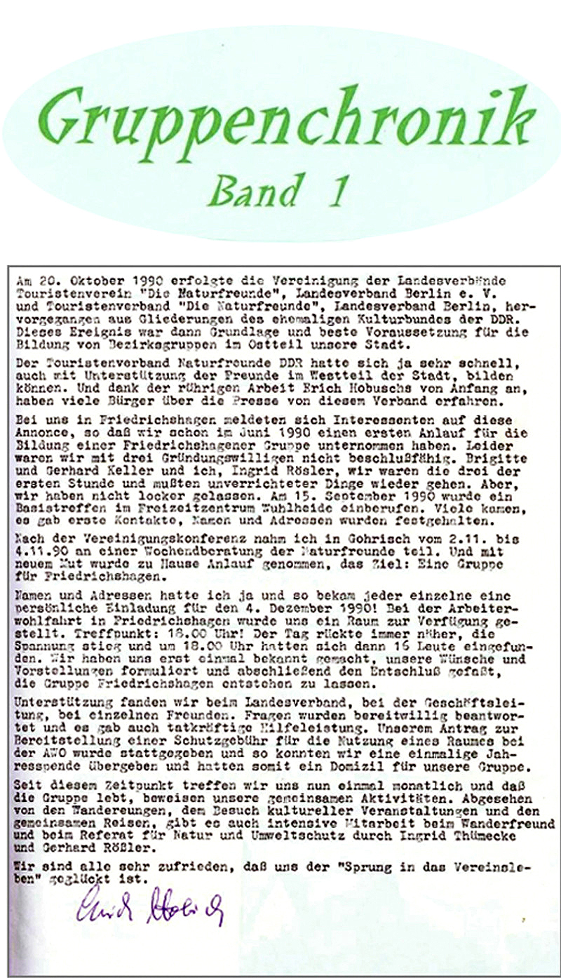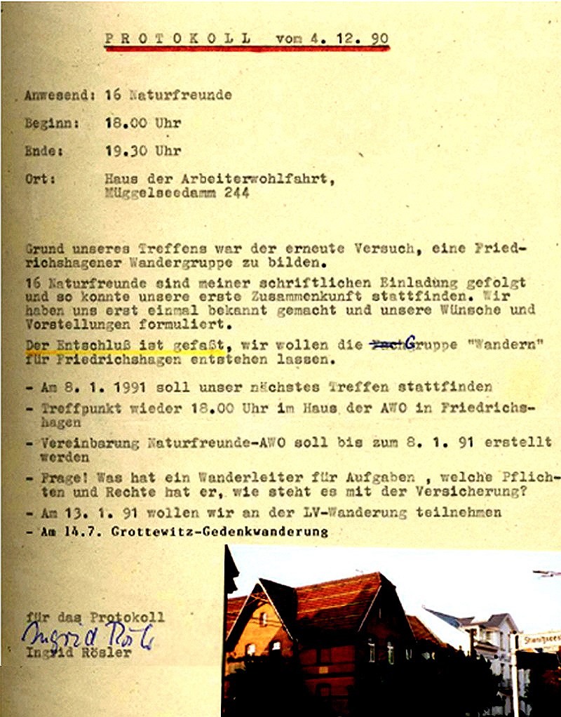 Ein Protokoll dokumentiert die ersten Aktivitäten der OG Friedrichshagen, z. B. die Vorbereitung der Grottewitz-Gedenkwanderung.