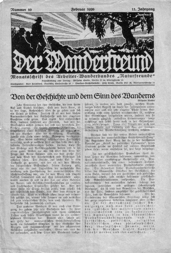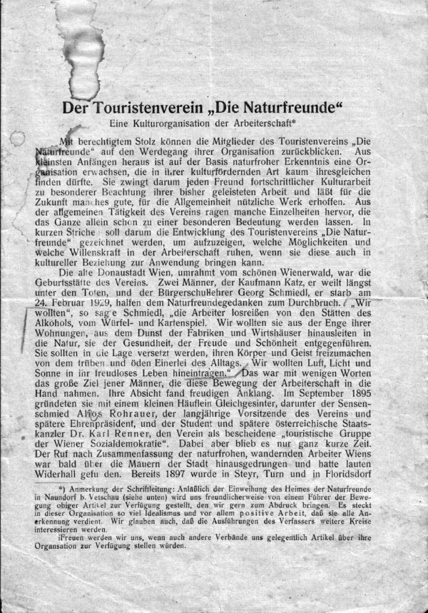 Willi Bulan verfasst einen mehrseitigen Artikel über den Touristenverein "Die NaturFreunde" als eine Kulturorganisation der Arbeiterschaft.