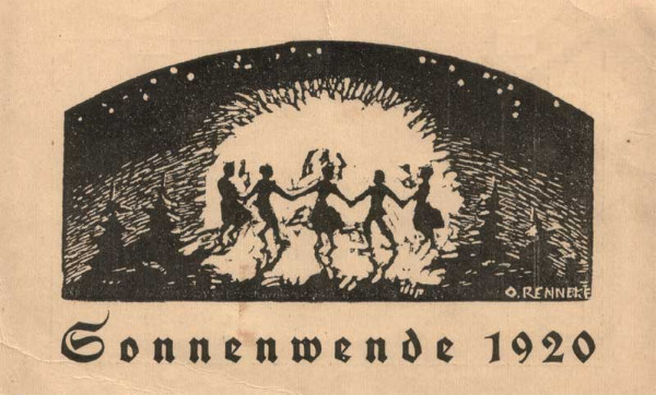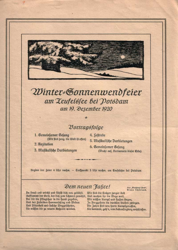 Eine Flugschrift lädt zur Sonnenwende ein. Zur Winter-Sonnenwendfeier am Teufelssee bei Potsdam gibt eine Flugschrift die Vortragsfolge bekannt.