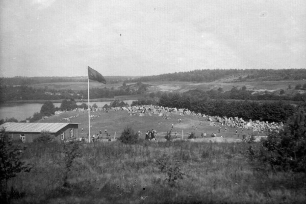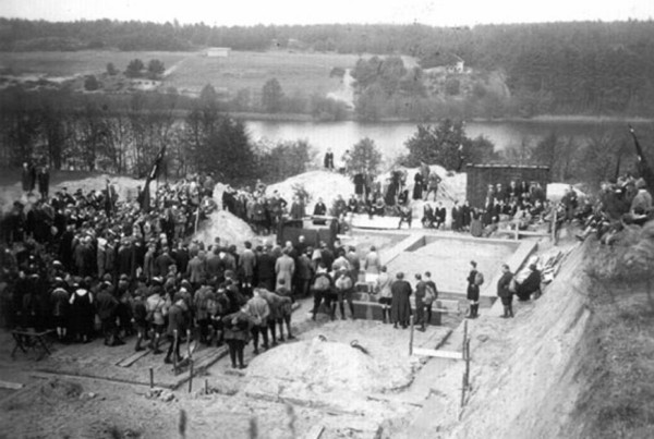 An der alten Unterkunftshütte mit Zeltlager wird feierlich der Grundstein zum Bau des TVDN-Heimes am Üdersee am 28.10.1928 gelegt.