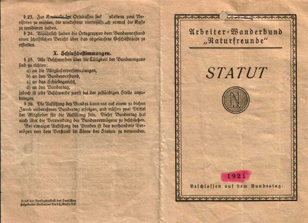 Die NaturFreunde gaben sich ein neues Statut, gedruckt in der Verlagsgesellschaft des Deutschen Holzarbeiter-Verbandes GmbH Berlin.