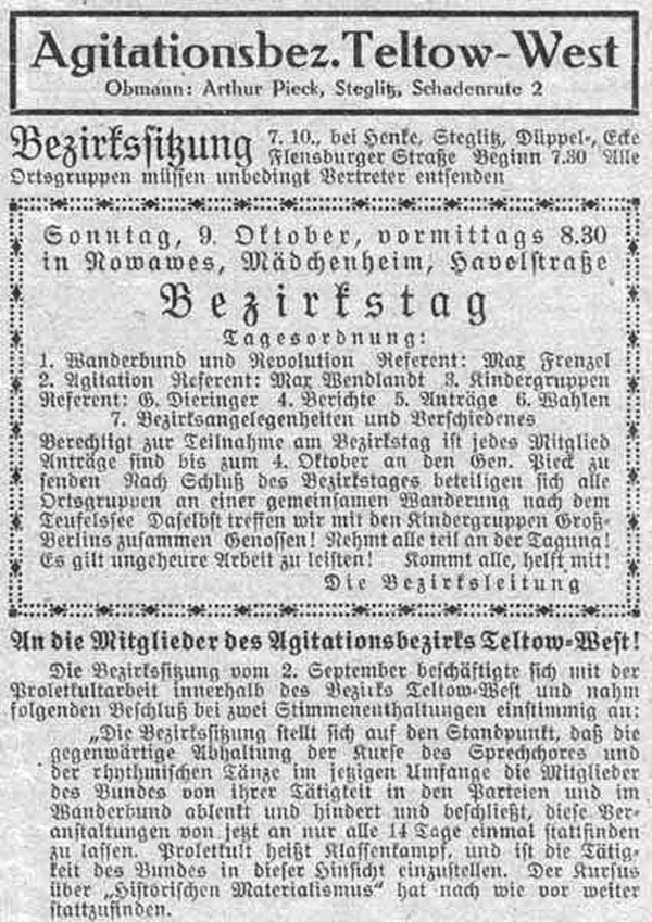 Der Obmann Arthur Pieck (Sohn von Wilhelm Pieck!) des Agitationsbezirks Teltow-West lädt per Zeitungsannonce zur Bezirkssitzung ein.