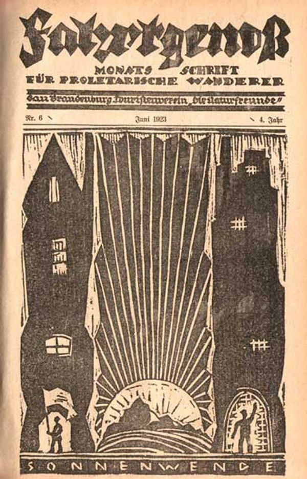 Die Monatsschrift für proletarische Wanderer Fahrtgenoß lädt in expressionistischer Aufmachung zur Sonnenwende ein.