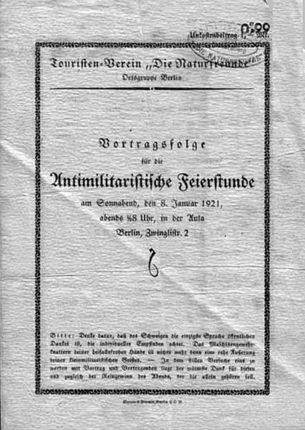 Die Ortsgruppe Berlin der NaturFreunde lädt zu einer Antimilitaristischen Feierstunde per Flugschrift ein.