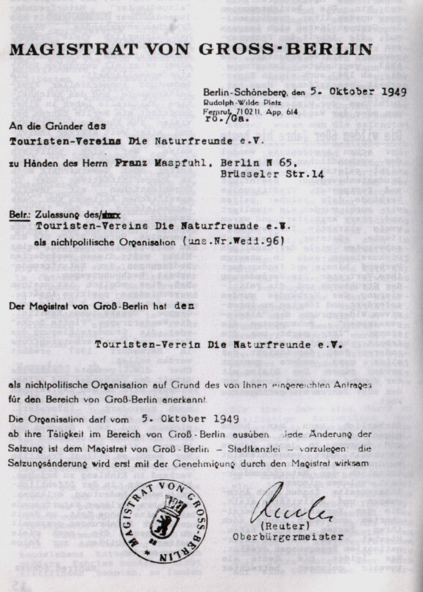 Der damalige Regierende Bürgermeister Ernst Reuter hat die Zulassungsurkunde für den Touristenverein "Die NaturFreunde" e.V. unterschrieben.