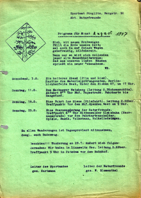 Das Sportamt Berlin-Steglitz war Herausgeber des Veranstaltungs-Programms der NaturFreunde-Wandersparte Steglitz (TVDN, Leiter: Wilhelm Blumenthal).