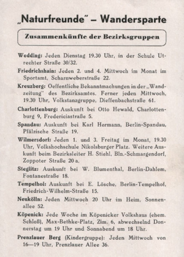 Die von den Alliierten in Berlin zugelassenen "NaturFreunde"-Wandersparten organisieren sich in fast allen Berliner Stadtbezirken.