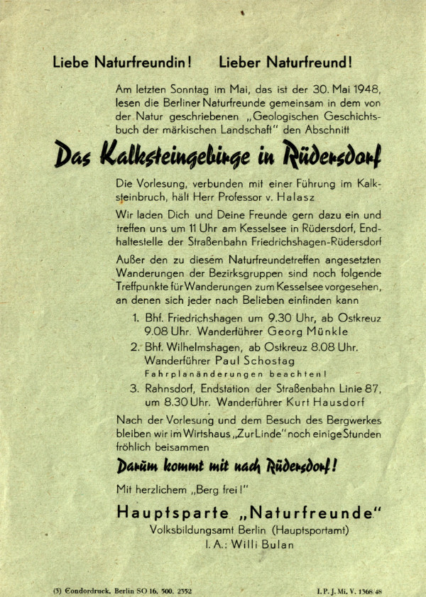Die Hauptsparte "NaturFreunde" im Volksbildungsamt Berlin (Hauptsportamt) wirbt für einen geologischen Vortrag - organisiert von Willi Bulan (seit 1912 Mitglied im AWB "NaturFreunde" , nach 1922 Übertritt zum TVDN und hier Gau-Obmann Berlin-Brandenburg , später hoher Kulturbund-Funktionär in der DDR).