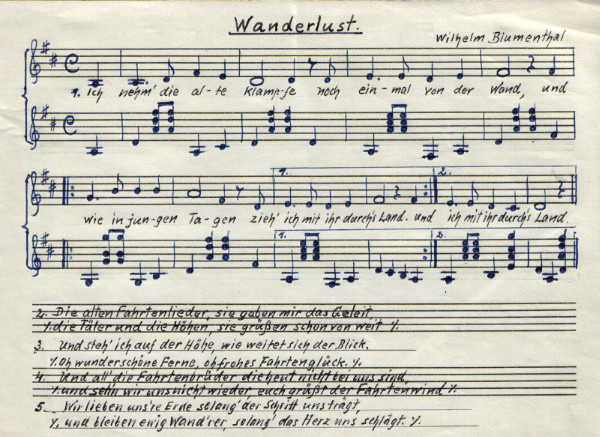 Der seinerzeit amtierende Vorsitzende des Landesverbandes der NaturFreunde Wilhelm Blumenthal hat für seine Mitglieder ein Wanderlied komponiert.