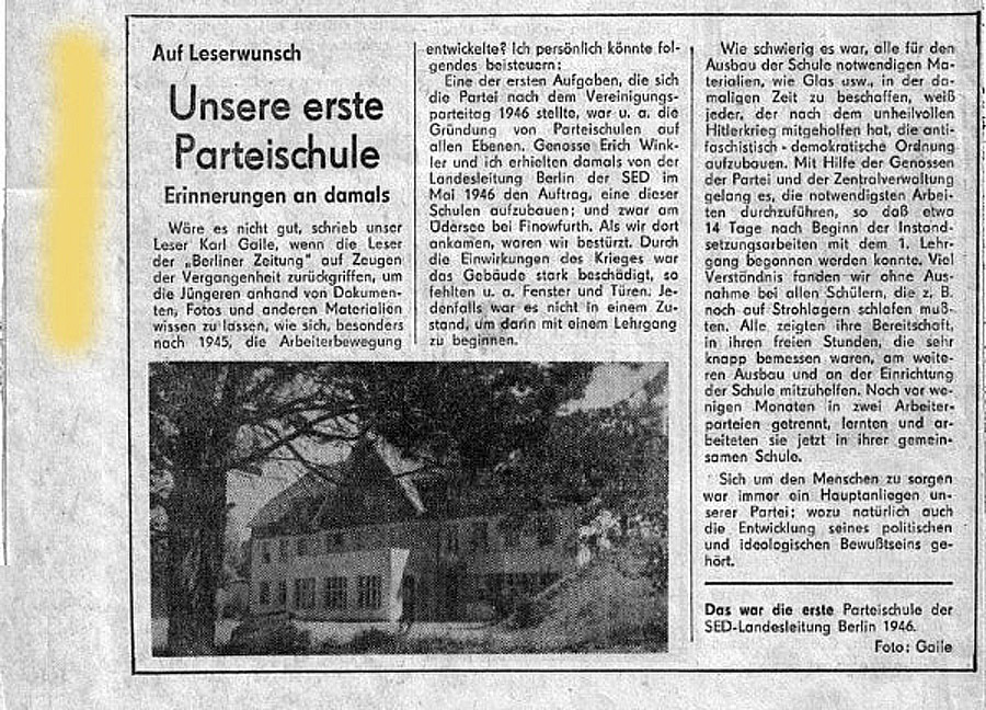 In der "Berliner Zeitung" erinnert sich ein SED-Genosse an das Haus am Üdersee: "Das war die erste Parteischule der SED-Landesleitung Berlin 1946" - offenbar ohne Kenntnis der Vergangenheit des Hauses.