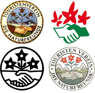 Das traditionelle Logo der NaturFreunde: der Handschlag mit den drei Alpenrosen ...1895 in Wien von österreichischen Sozialisten gegründet,